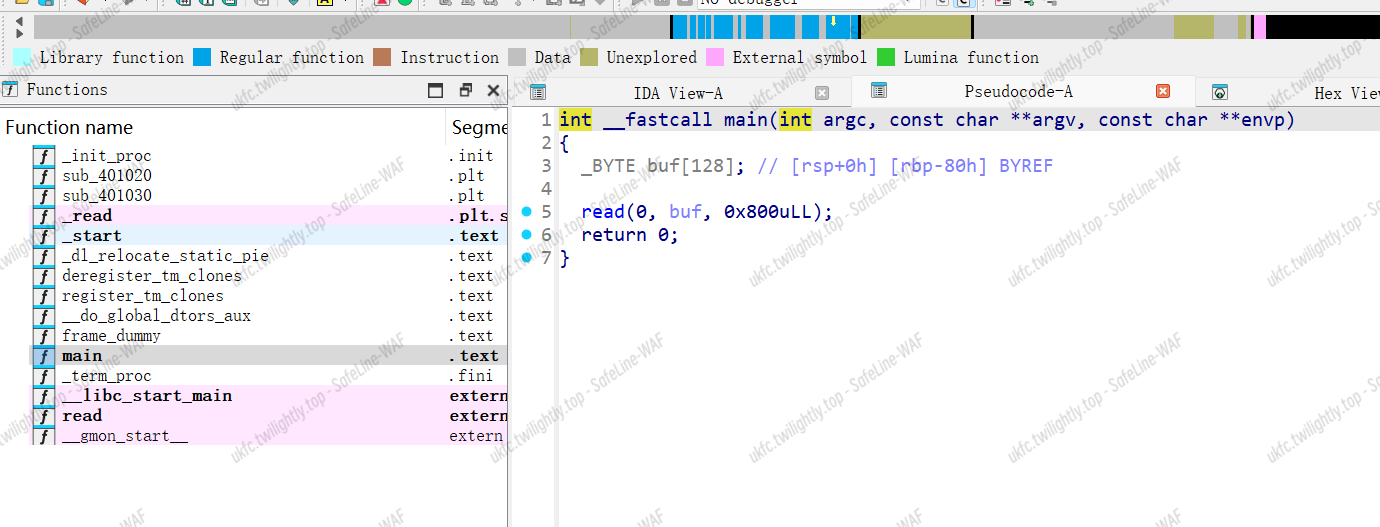 十分简洁的题目,只有一个可以溢出的 read() ,没有输出函数,几乎没有很多有用的 gadget