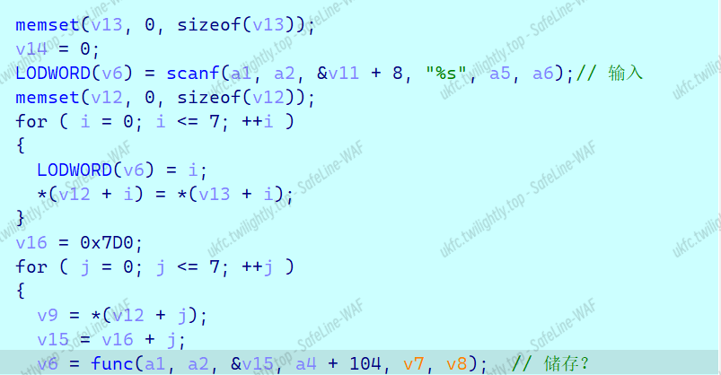 在输入的地方有一个 func 函数,用来储存,后面 vm 循环和最后密文 check 的地方都调用了这个函数