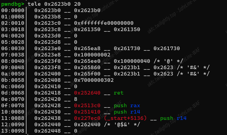 然后我们需要劫持执行流到堆这里,布置 gadget ,这时候我们需要执行的就是 wp 的 magic gadget,通过适配 gadget 进行堆布局,进而执行 rop 流