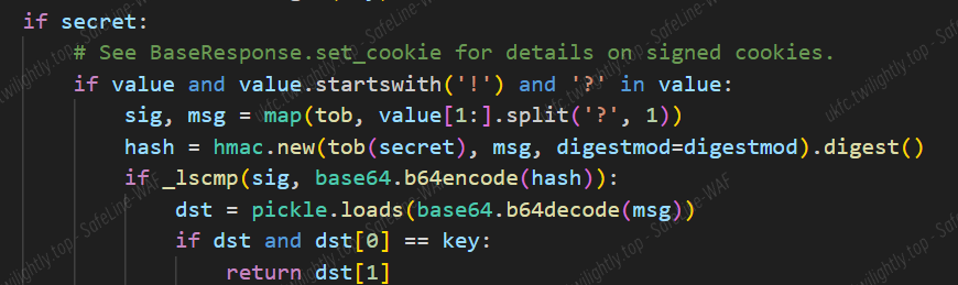cookie 的格式:pickle 序列化后使用密钥进行 sha256 加密生成 base64 格式的签名,"!+{签名}+?+{数据}"