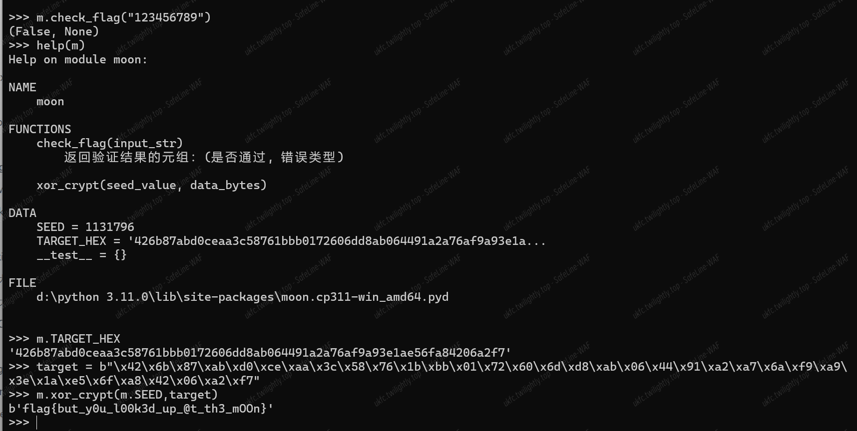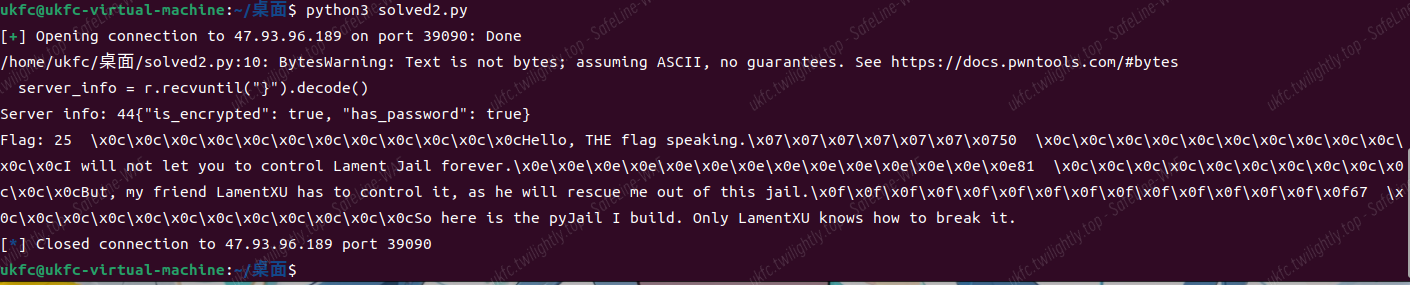 - 主函数 main():监听 13337 端口,要求密码"LetsLament"进行连接,接收用户上传的 Python 代码,在沙箱环境中执行代码并返回输出